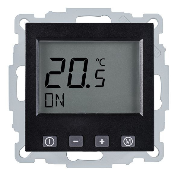 Fußbodenheizungsregler u.P. Digital, zur Regelung der Fußbodentemperatur unabhängig der Raumtemperatur, ohne Zeitschaltuhr, großes, beleuchtetes Display, einschl. Zentralscheibe, ohne Abdeckrahmen, einfache Bedienung, Ist- und Solltemperaturanzeige, 10(4)A, 230V, einschl. Fühler (NTC, 33kOhm bei 25°C) mit 4,00 m Leitung, ohne Fühlerhülse, Umstellmöglichkeit auf Heizen/Kühlen-Funktion und auf Schließerkontakt, Farbe: schwarz/graphitschwarz matt (lackiert), passend in folgende Schalterprogramme: Gira System 55, Jung Serie A und AS, Merten Serie System M, Busch-Jaeger Serie Balance SI