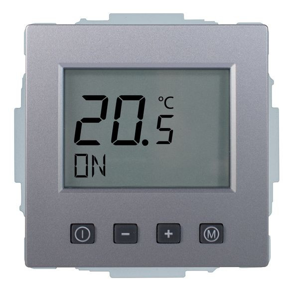 Fußbodenheizungsregler u.P. Digital, zur Regelung der Fußbodentemperatur unabhängig der Raumtemperatur, ohne Zeitschaltuhr, großes, beleuchtetes Display, einschl. Zentralscheibe, ohne Abdeckrahmen, einfache Bedienung, Ist- und Solltemperaturanzeige, 10(4)A, 230V, einschl. Fühler (NTC, 33kOhm bei 25°C) mit 4,00 m Leitung, ohne Fühlerhülse, Umstellmöglichkeit auf Heizen/Kühlen-Funktion und auf Schließerkontakt, Farbe: edelstahlfarbig (lackiert), passend in folgende Schalterprogramme: Busch-Jaeger future, future-linear, solo, axcent, carat, dynasty und pur edelstahl