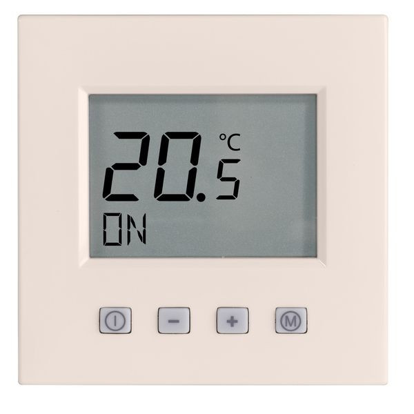 Fußbodenheizungsregler u.P. Digital, zur Regelung der Fußbodentemperatur unabhängig der Raumtemperatur, ohne Zeitschaltuhr, großes, beleuchtetes Display, einschl. Zentralscheibe, ohne Abdeckrahmen, einfache Bedienung, Ist- und Solltemperaturanzeige, 10(4)A, 230V, einschl. Fühler (NTC, 33kOhm bei 25°C) mit 4,00 m Leitung, ohne Fühlerhülse, Umstellmöglichkeit auf Heizen/Kühlen-Funktion und auf Schließerkontakt, Farbe: cremeweiß glänzend, ähnlich RAL1013, passend in folgende Schalterprogramme: Jung Serie LS