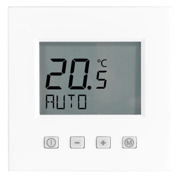Fußbodenheizungsregler u.P. Komfort, zur Regelung der Fußbodentemperatur unabhängig der Raumtemperatur, mit Zeitschaltuhr, großes, beleuchtetes Display, einschl. Zentralscheibe, ohne Abdeckrahmen, einfache Bedienung, Ist- und Solltemperaturanzeige, 10(4)A, 230V, einschl. Fühler (NTC, 33kOhm bei 25°C) mit 4,00 m Leitung, ohne Fühlerhülse, Umstellmöglichkeit auf Heizen/Kühlen-Funktion und auf Schließerkontakt, selbstlernendes Regelverhalten, Farbe: reinweiß glänzend, ähnlich RAL9010, passend in folgende Schalterprogramme: Jung Serie LS, Gira Flächenschalter