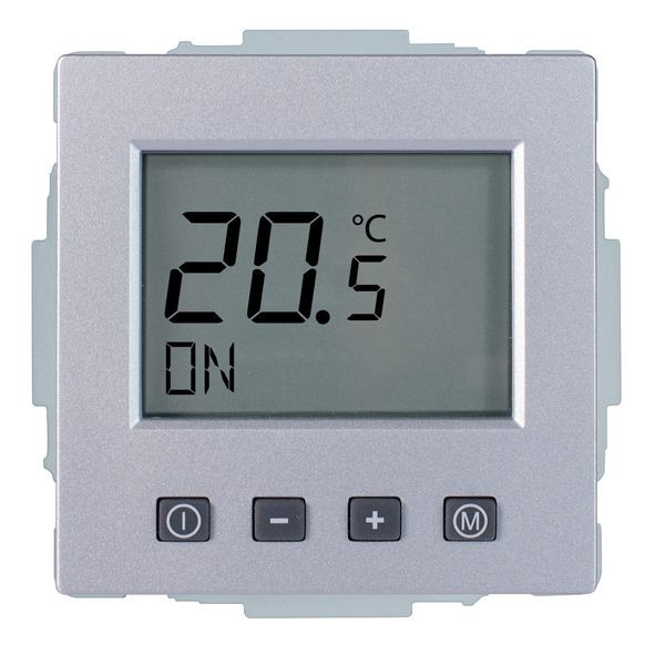 Raumtemperaturregler u.P. Digital, zur Regelung der Raumtemperatur und gleichzeitiger Begrenzung der Fußbodentemperatur, ohne Zeitschaltuhr, großes, beleuchtetes Display, einschl. Zentralscheibe, ohne Abdeckrahmen, einfache Bedienung, Ist- und Solltemperaturanzeige, 10(4)A, 230V, einschl. Fühler (NTC, 33kOhm bei 25°C) mit 4,00 m Leitung, ohne Fühlerhülse, Umstellmöglichkeit auf Heizen/Kühlen-Funktion und auf Schließerkontakt, Farbe: alu glänzend (lackiert), passend in folgende Schalterprogramme: Busch-Jaeger future, future-linear, solo, axcent, carat, dynasty und pur edelstahl