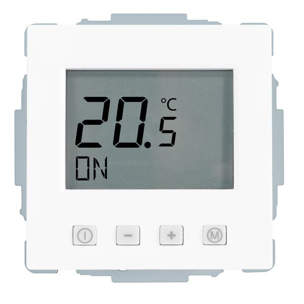 Raumtemperaturregler u.P. Digital, zur Regelung der Raumtemperatur und gleichzeitiger Begrenzung der Fußbodentemperatur, ohne Zeitschaltuhr, großes, beleuchtetes Display, einschl. Zentralscheibe, ohne Abdeckrahmen, einfache Bedienung, Ist- und Solltemperaturanzeige, 10(4)A, 230V, einschl. Fühler (NTC, 33kOhm bei 25°C) mit 4,00 m Leitung, ohne Fühlerhülse, Umstellmöglichkeit auf Heizen/Kühlen-Funktion und auf Schließerkontakt, Farbe: studioweiß glänzend, ähnlich RAL9016, passend in folgende Schalterprogramme: Busch-Jaeger future, future-linear, solo, axcent, carat, dynasty und pur edelstahl