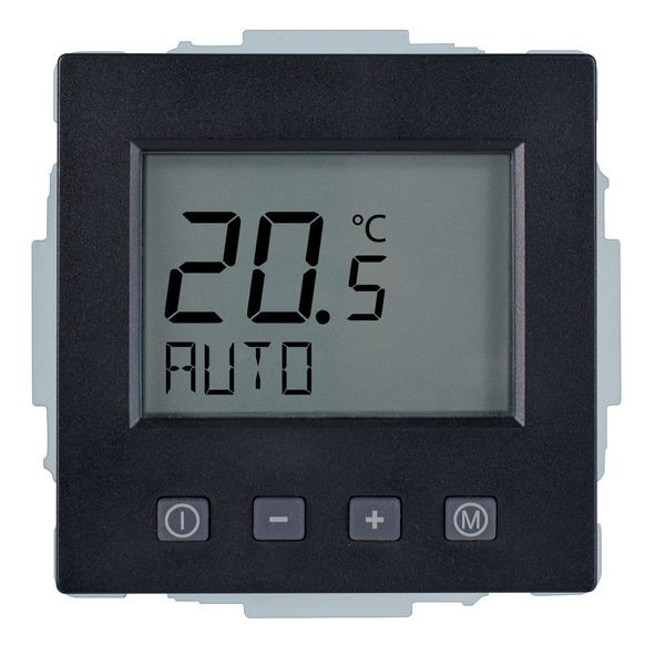 Raumtemperaturregler u.P. Komfort, zur Regelung der Raumtemperatur und gleichzeitiger Begrenzung der Fußbodentemperatur, mit Zeitschaltuhr, großes, beleuchtetes Display, einschl. Zentralscheibe, ohne Abdeckrahmen, einfache Bedienung, Ist- und Solltemperaturanzeige, 10(4)A, 230V, einschl. Fühler (NTC, 33kOhm bei 25°C) mit 4,00 m Leitung, ohne Fühlerhülse, Umstellmöglichkeit auf Heizen/Kühlen-Funktion und auf Schließerkontakt, selbstlernendes Regelverhalten, Farbe: schwarz matt, passend in folgende Schalterprogramme: Busch-Jaeger future, future-linear, solo, axcent, carat, dynasty und pur edelstahl