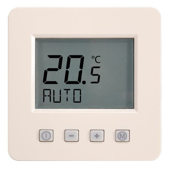 Raumtemperaturregler u.P. Komfort, zur Regelung der Raumtemperatur und gleichzeitiger Begrenzung der Fußbodentemperatur, mit Zeitschaltuhr, großes, beleuchtetes Display, einschl. Zentralscheibe, ohne Abdeckrahmen, einfache Bedienung, Ist- und Solltemperaturanzeige, 10(4)A, 230V, einschl. Fühler (NTC, 33kOhm bei 25°C) mit 4,00 m Leitung, ohne Fühlerhülse, Umstellmöglichkeit auf Heizen/Kühlen-Funktion und auf Schließerkontakt, selbstlernendes Regelverhalten, Farbe: cremeweiß glänzend, ähnlich RAL1013, passend in folgendes Schalterprogramm: Jung Serie CD 500, CD plus, CD 500 Aufputz