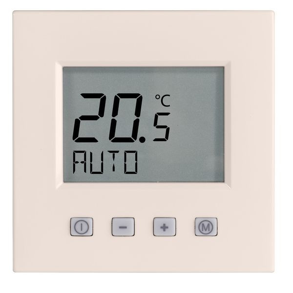 Raumtemperaturregler u.P. Komfort, zur Regelung der Raumtemperatur und gleichzeitiger Begrenzung der Fußbodentemperatur, mit Zeitschaltuhr, großes, beleuchtetes Display, einschl. Zentralscheibe, ohne Abdeckrahmen, einfache Bedienung, Ist- und Solltemperaturanzeige, 10(4)A, 230V, einschl. Fühler (NTC, 33kOhm bei 25°C) mit 4,00 m Leitung, ohne Fühlerhülse, Umstellmöglichkeit auf Heizen/Kühlen-Funktion und auf Schließerkontakt, selbstlernendes Regelverhalten, Farbe: cremeweiß glänzend, ähnlich RAL1013, passend in folgende Schalterprogramme: Jung Serie LS