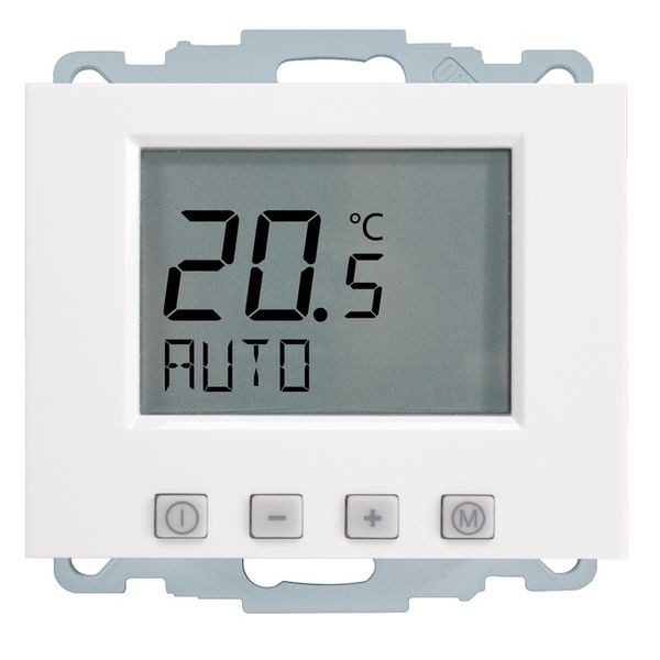 Raumtemperaturregler u.P. Komfort, zur Regelung der Raumtemperatur und gleichzeitiger Begrenzung der Fußbodentemperatur, mit Zeitschaltuhr, großes, beleuchtetes Display, einschl. Zentralscheibe, ohne Abdeckrahmen, einfache Bedienung, Ist- und Solltemperaturanzeige, 10(4)A, 230V, einschl. Fühler (NTC, 33kOhm bei 25°C) mit 4,00 m Leitung, ohne Fühlerhülse, Umstellmöglichkeit auf Heizen/Kühlen-Funktion und auf Schließerkontakt, selbstlernendes Regelverhalten, Farbe: polarweiß glänzend, ähnlich RAL9010, passend in folgendes Schalterprogramm: Berker Serie K.1, K.5