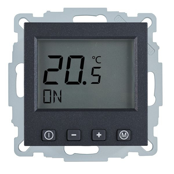 Raumtemperaturregler u.P. Digital, ohne Zeitschaltuhr, großes, beleuchtetes Display, einschl. Zentralscheibe, ohne Abdeckrahmen, einfache Bedienung, Ist- und Solltemperaturanzeige, 10(4)A, 230V, Pumpenschutzfunktion, Umstellmöglichkeit auf Heizen/Kühlen-Funktion und auf Schließerkontakt, für Stellantriebe stromlos geschlossen und stromlos offen, Farbe: anthrazit matt (lackiert), passend in folgendes Schalterprogramm: Jung Serie A