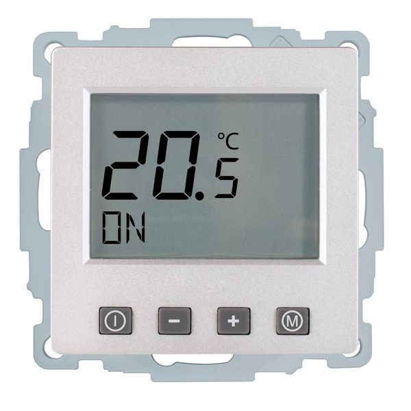Raumtemperaturregler u.P. Digital, ohne Zeitschaltuhr, großes, beleuchtetes Display, einschl. Zentralscheibe, ohne Abdeckrahmen, einfache Bedienung, Ist- und Solltemperaturanzeige, 10(4)A, 230V, Pumpenschutzfunktion, Umstellmöglichkeit auf Heizen/Kühlen-Funktion und auf Schließerkontakt, für Stellantriebe stromlos geschlossen und stromlos offen, Farbe: alu samt lackiert, passend in folgende Schalterprogramme: Berker Q.1, Q.3, Q.7