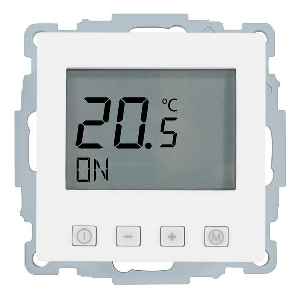 Raumtemperaturregler u.P. Digital, ohne Zeitschaltuhr, großes, beleuchtetes Display, einschl. Zentralscheibe, ohne Abdeckrahmen, einfache Bedienung, Ist- und Solltemperaturanzeige, 10(4)A, 230V, Pumpenschutzfunktion, Umstellmöglichkeit auf Heizen/Kühlen-Funktion und auf Schließerkontakt, für Stellantriebe stromlos geschlossen und stromlos offen, Farbe: polarweiß samt, ähnlich RAL9010, passend in folgende Schalterprogramme: Berker Q.1, Q.3, Q.7