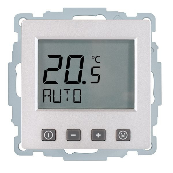 Raumtemperaturregler u.P. Komfort, mit Zeitschaltuhr, großes, beleuchtetes Display, einschl. Zentralscheibe, ohne Abdeckrahmen, einfache Bedienung, Ist- und Solltemperaturanzeige, 10(4)A, 230V, Pumpenschutzfunktion, Umstellmöglichkeit auf Heizen/Kühlen-Funktion und auf Schließerkontakt, für Stellantriebe stromlos geschlossen und stromlos offen, selbstlernendes Regelverhalten, Farbe: alu samt lackiert, passend in folgende Schalterprogramme: Berker Q.1, Q.3, Q.7