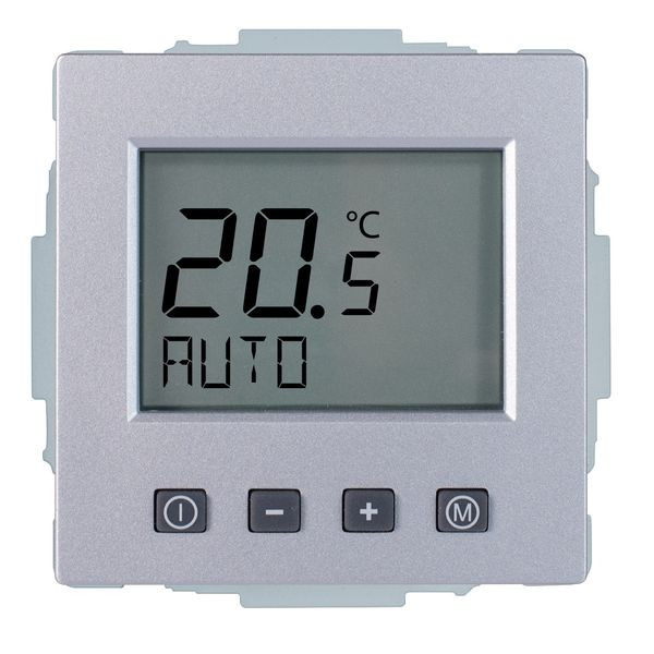 Raumtemperaturregler u.P. Komfort, mit Zeitschaltuhr, großes, beleuchtetes Display, einschl. Zentralscheibe, ohne Abdeckrahmen, einfache Bedienung, Ist- und Solltemperaturanzeige, 10(4)A, 230V, Pumpenschutzfunktion, Umstellmöglichkeit auf Heizen/Kühlen-Funktion und auf Schließerkontakt, für Stellantriebe stromlos geschlossen und stromlos offen, selbstlernendes Regelverhalten, Farbe: alu glänzend (lackiert), passend in folgende Schalterprogramme: Busch-Jaeger future, future-linear, solo, axcent, carat, dynasty und pur edelstahl