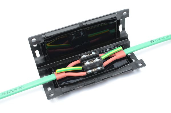 Heizbandverbindungsgarnitur, Gelanschlusstechnik (Kaltanschlusstechnik), für zwei selbstlimitierende Heizbänder, Betriebsspannung 230V, Schutzart IP68 (nicht für die Verlegung in der Dachrinne zugelassen), temperaturbeständig -25…+80°C (Anschlusstechnik), +60°C (Anschlussleitung)