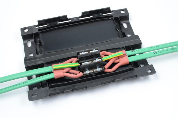 Heizband-X-Abzweig, Gelanschlusstechnik (Kaltanschlusstechnik), für die Verbindung von vier selbstlimitierenden Heizbändern, einschl. zwei Endabschlüsse, Betriebsspannung 230V, Schutzart IP68 (nicht für die Verlegung in der Dachrinne zugelassen), temperaturbeständig -25…+80°C (Anschlusstechnik), +60°C (Anschlussleitung)