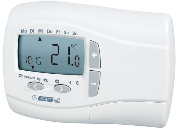 Funksender digital, Abmessung: 137 x 96,5 x 31,3 mm, Einstellbereich 5...32°C, Farbe: reinweiß, ähnlich RAL9010, Versorgungsspannung (Batterie) 2 x 1,5 V, mit Digitaluhr, in Verbindung mit Funkempfänger Typ Instat 868-a1S, Instat 868-a1A, Instat 868-a4, Instat 868-a6 oder Instat 868-a8U (nicht im Lieferumfang enthalten)