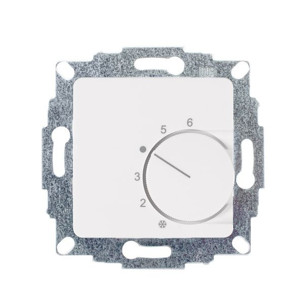 Raumtemperaturregler u.P., 230 V, einschl. Zentralscheibe 50x50mm, ohne Abdeckrahmen, Öffnerkontakt 10(4)A, für Stellantriebe stromlos geschlossen, Einstellbereich 5…30°C mit Bereichseinengung, Temperaturabsenkung, Berührungsschutzkappe, Farbe: studioweiß matt, ähnlich RAL9016, passend in nahezu alle Schalterprogramme mittels Zwischenrahmen 50x50mm (nicht im Lieferumfang enthalten)