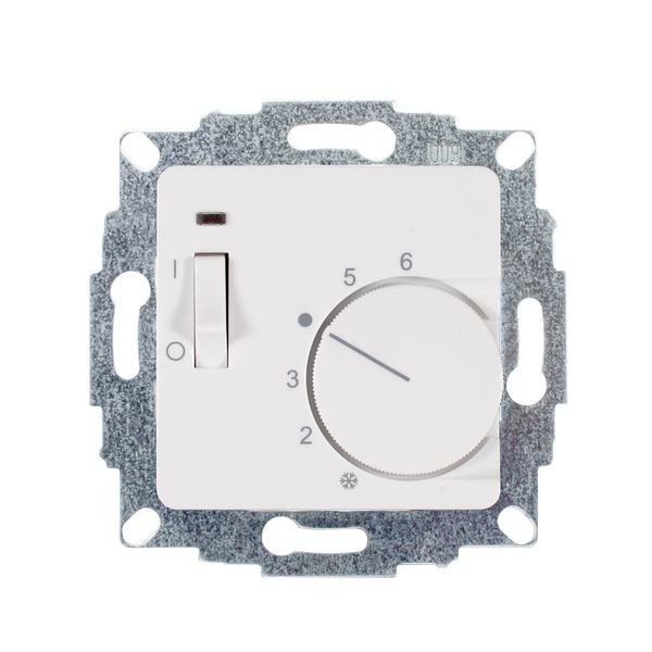 Raumtemperaturregler u.P., 230 V, einschl. Zentralscheibe 50x50mm, ohne Abdeckrahmen, mit Schalter Ein/Aus und LED Heizung ein, Öffnerkontakt 10(4)A, für Stellantriebe stromlos geschlossen, Einstellbereich 5…30°C mit Bereichseinengung, Temperaturabsenkung, Berührungsschutzkappe, Farbe: studioweiß glänzend, ähnlich RAL9016, passend in nahezu alle Schalterprogramme mittels Zwischenrahmen 50x50mm (nicht im Lieferumfang enthalten)