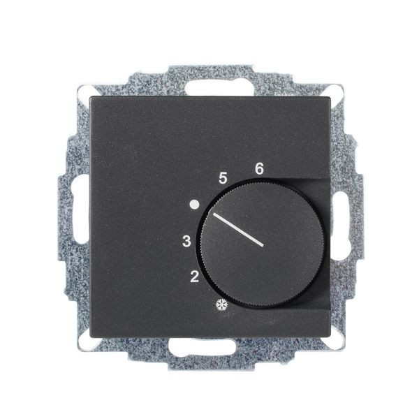Raumtemperaturregler u.P., 230 V, einschl. Zentralscheibe 55x55mm, ohne Abdeckrahmen, Wechslerkontakt 10(4)A Heizen, 5(2)A Kühlen, für Stellantriebe stromlos geschlossen und stromlos offen, Einstellbereich 5…30°C mit Bereichseinengung, Temperaturabsenkung, Berührungsschutzkappe, Farbe: anthrazit matt (lackiert), passend in folgendes Schalterprogramm: Jung Serie A