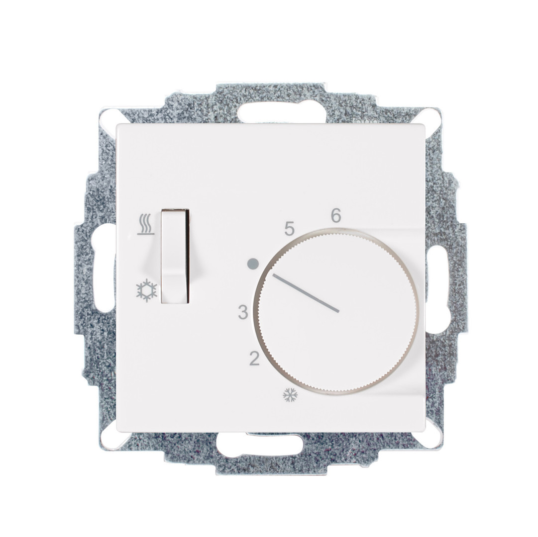 Raumtemperaturregler u.P., 230 V, einschl. Zentralscheibe, ohne Abdeckrahmen, Ausführung für Heiz- oder Kühlbetrieb über Ein-Rohr-System zur Ansteuerung von Stellantrieb "stromlos geschlossen“, mit Umschalter "Heiz- oder Kühlbetrieb", Wechslerkontakt 5(2)A, Einstellbereich 5…30°C mit Bereichseinengung, Berührungsschutzkappe, Farbe: ultraweiß glänzend, ähnlich RAL9003, passend in folgendes Schalterprogramm: legrand SEANO