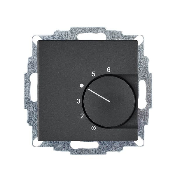Raumtemperaturregler u.P., 24 V, einschl. Zentralscheibe 55x55mm, ohne Abdeckrahmen, Öffnerkontakt 4A UC, für Stellantriebe stromlos geschlossen, Einstellbereich 5…30°C mit Bereichseinengung, Temperaturabsenkung, Berührungsschutzkappe, Farbe: anthrazit matt (lackiert), passend in folgende Schalterprogramme: Gira System 55, Berker Serie S.1 / B.3 / B.7, Merten Serie System M
