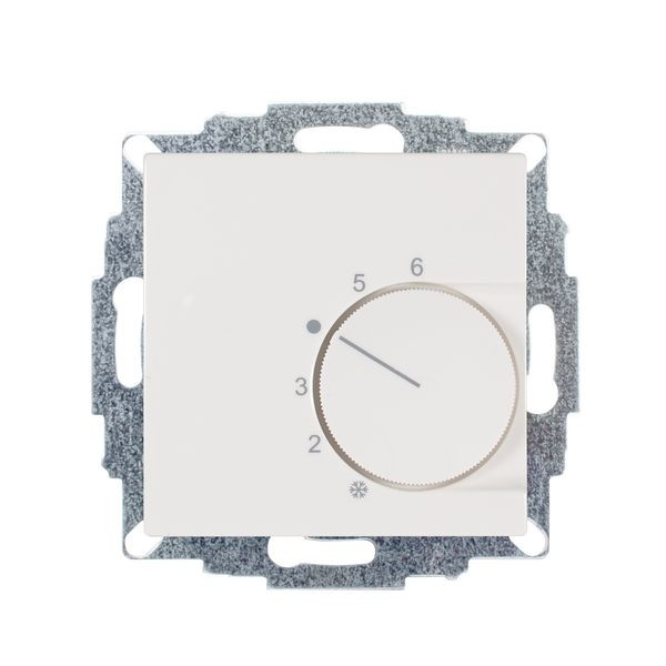 Raumtemperaturregler u.P., 230 V, einschl. Zentralscheibe, ohne Abdeckrahmen, für Stellantriebe stromlos offen und stromlos geschlossen, Triac-Ausgang für max. 5 Stellantriebe (3W elektromechanisch), mit TA-Eingang (3,5°C), Einstellbereich 5…30°C mit Bereichseinengung, mit Berührungsschutzkappe, Anschluss für 230V-Eingangssignal Heizen/Kühlen (Change Over) vom gleichen FI und LS, ohne LED , Farbe: reinweiß matt, ähnlich RAL9010, passend in folgende Schalterprogramme: Gira System 55, Berker Serie S.1 / B.3 / B.7, Merten Serie System M, Jung Serie A und AS. Maximale Leitungslänge für Heizen/Kühlen-Eingang: 100 m. Im Falle größerer Leitungslängen ist u.U. ein Entstör-Kondensator 0,33 Mikrofarad zwischen Steuerleitung Heizen/Kühlen und Neutralleiter erforderlich.