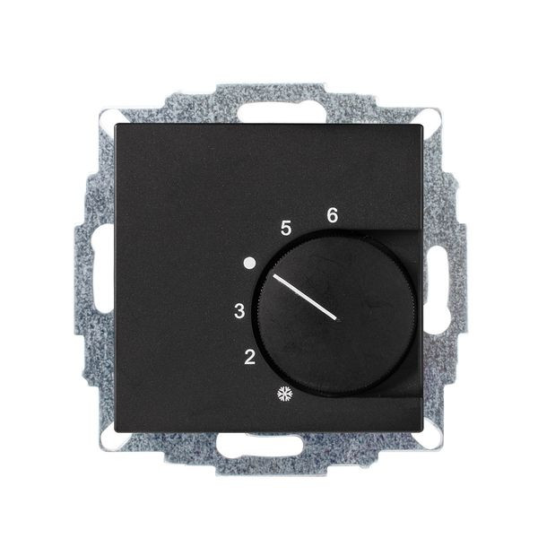 Raumtemperaturregler u.P., 230 V, einschl. Zentralscheibe, ohne Abdeckrahmen, für Stellantriebe stromlos offen und stromlos geschlossen, Triac-Ausgang für max. 5 Stellantriebe (3W elektromechanisch), mit TA-Eingang (3,5°C), Einstellbereich 5…30°C mit Bereichseinengung, mit Berührungsschutzkappe, Anschluss für 230V-Eingangssignal Heizen/Kühlen (Change Over) vom gleichen FI und LS, ohne LED , Farbe: schwarz/graphitschwarz matt (lackiert), passend in folgende Schalterprogramme: Gira System 55, Jung Serie A und AS, Merten Serie System M, Busch-Jaeger Serie Balance SI. Maximale Leitungslänge für Heizen/Kühlen-Eingang: 100 m. Im Falle größerer Leitungslängen ist u.U. ein Entstör-Kondensator 0,33 Mikrofarad zwischen Steuerleitung Heizen/Kühlen und Neutralleiter erforderlich.