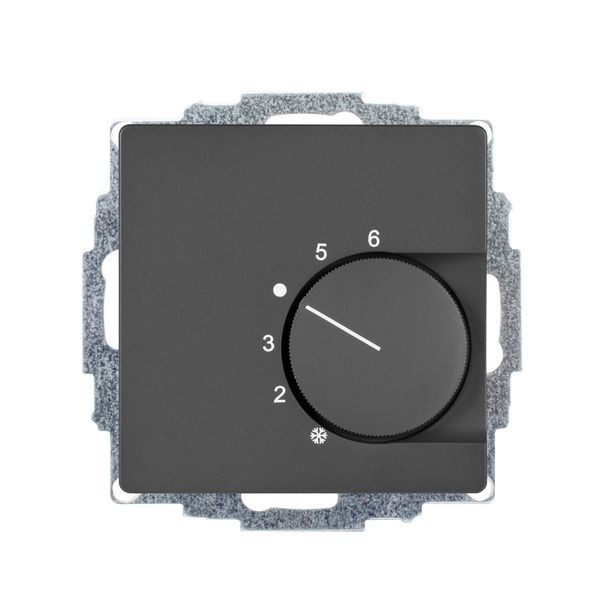 Raumtemperaturregler u.P., 230 V, einschl. Zentralscheibe, ohne Abdeckrahmen, Wechslerkontakt 10(4)A Heizen, 5(2)A Kühlen, für Stellantriebe stromlos geschlossen und stromlos offen, Einstellbereich 5…30°C mit Bereichseinengung, Temperaturabsenkung, Berührungsschutzkappe, Farbe: anthrazit samt lackiert, passend in folgende Schalterprogramme: Berker Q.1, Q.3, Q.7