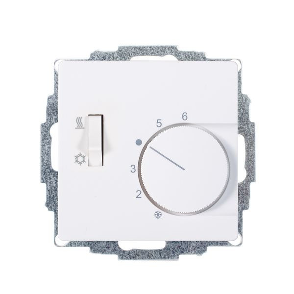 Raumtemperaturregler u.P., 230 V, einschl. Zentralscheibe, ohne Abdeckrahmen, Ausführung für Heiz- oder Kühlbetrieb über Ein-Rohr-System zur Ansteuerung von Stellantrieben stromlos geschlossen, mit Umschalter Heiz- oder Kühlbetrieb, Wechslerkontakt 5(2)A, Einstellbereich 5…30°C mit Bereichseinengung, Berührungsschutzkappe, Farbe: polarweiß samt, ähnlich RAL9010, passend in folgende Schalterprogramme: Berker Q.1, Q.3, Q.7