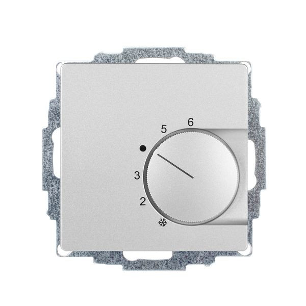 Raumtemperaturregler u.P., 24 V, einschl. Zentralscheibe, ohne Abdeckrahmen, Öffnerkontakt 4A UC, für Stellantriebe stromlos geschlossen, Einstellbereich 5…30°C mit Bereichseinengung, Temperaturabsenkung, Berührungsschutzkappe, Farbe: alu samt lackiert, passend in folgende Schalterprogramme: Berker Q.1, Q.3, Q.7
