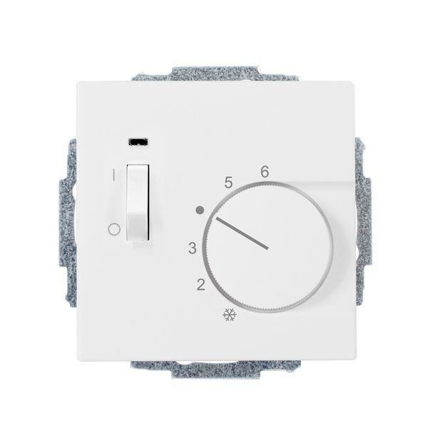 Raumtemperaturregler u.P., 230 V, einschl. Zentralscheibe, ohne Abdeckrahmen, mit Schalter Ein/Aus und LED Heizung ein, Öffnerkontakt 10(4)A, für Stellantriebe stromlos geschlossen, Einstellbereich 5…30°C mit Bereichseinengung, Temperaturabsenkung, Berührungsschutzkappe, Farbe: studioweiß glänzend, ähnlich RAL9016, passend in folgende Schalterprogramme: Busch-Jaeger future, future-linear, solo, axcent, carat, dynasty und pur edelstahl