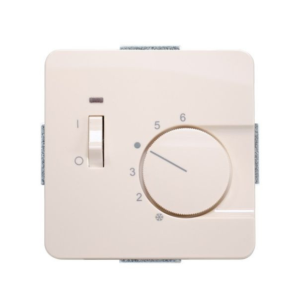 Raumtemperaturregler u.P., 230 V, einschl. Zentralscheibe, ohne Abdeckrahmen, mit Schalter Ein/Aus und LED Heizung ein, Öffnerkontakt 10(4)A, für Stellantriebe stromlos geschlossen, Einstellbereich 5…30°C mit Bereichseinengung, Temperaturabsenkung, Berührungsschutzkappe, Farbe: cremeweiß glänzend, ähnlich RAL1013, passend in folgende Schalterprogramme: Jung Serie CD 500, CD plus, CD 500 Aufputz