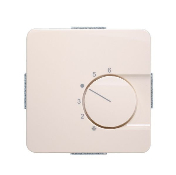 Raumtemperaturregler u.P., 230 V, einschl. Zentralscheibe, ohne Abdeckrahmen, für Stellantriebe stromlos offen und stromlos geschlossen, Triac-Ausgang für max. 5 Stellantriebe (3W elektromechanisch), ohne TA-Eingang, Einstellbereich 5…30°C mit Bereichseinengung, mit Berührungsschutzkappe, Farbe: cremeweiß glänzend, ähnlich RAL1013, passend in folgende Schalterprogramme: Jung Serie CD 500, CD plus, CD 500 Aufputz