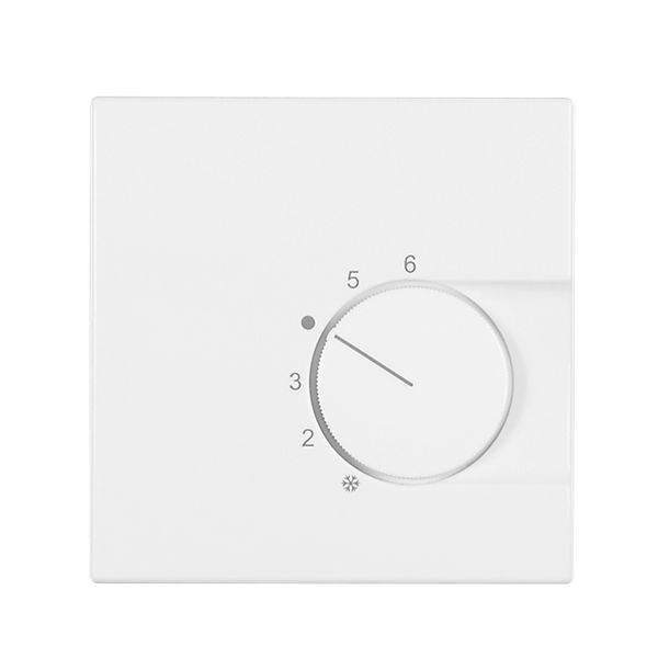 Raumtemperaturregler u.P., 230 V, einschl. Zentralscheibe, ohne Abdeckrahmen, Wechslerkontakt 10(4)A Heizen, 5(2)A Kühlen, für Stellantriebe stromlos geschlossen und stromlos offen, Einstellbereich 5…30°C mit Bereichseinengung, Temperaturabsenkung, Berührungsschutzkappe, Farbe: reinweiß (schneeweiß) matt lackiert, ähnlich RAL9010, passend in folgendes Schalterprogramm: Jung Serie LS
