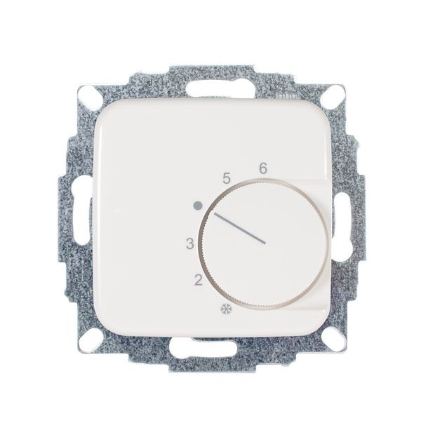 Raumtemperaturregler u.P., 230 V, einschl. Zentralscheibe, ohne Abdeckrahmen, Wechslerkontakt 10(4)A Heizen, 5(2)A Kühlen, für Stellantriebe stromlos geschlossen und stromlos offen, Einstellbereich 5…30°C mit Bereichseinengung, Temperaturabsenkung, Berührungsschutzkappe, Farbe: reinweiß glänzend, ähnlich RAL9010, passend in folgendes Schalterprogramm: Busch-Jaeger Reflex SI, SI Linear