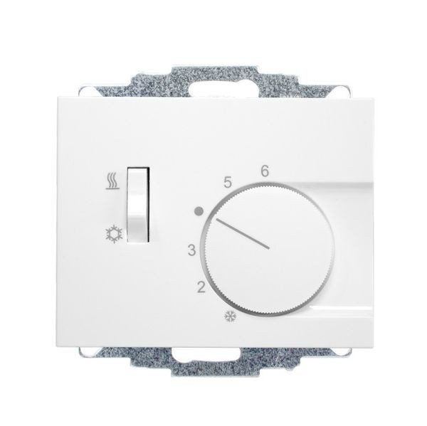 Raumtemperaturregler u.P., 230 V, einschl. Zentralscheibe, ohne Abdeckrahmen, Ausführungfür Heiz- oder Kühlbetrieb über Ein-Rohr-System zur Ansteuerung von Stellantrieben stromlos geschlossen, mit Umschalter Heiz- oder Kühlbetrieb, Wechslerkontakt 5(2)A, Einstellbereich 5…30°C mit Bereichseinengung, Berührungsschutzkappe, Farbe: polarweiß glänzend, ähnlich RAL9010, passend in folgende Schalterprogramme: Berker K.1, K.5