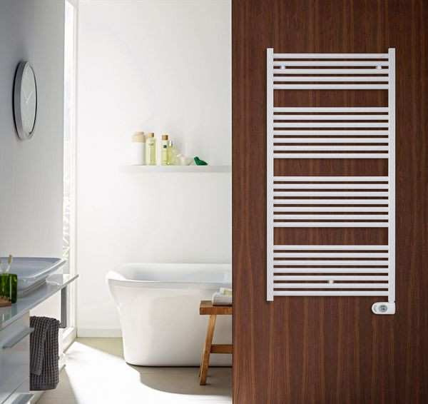 Badheizkörper, 500 W, steckerfertig mit 1,20 m Anschlussleitung, Farbe: weiß (ähnlich RAL9016), Abmessungen 1258x500x95 mm, Schutzklasse II, spritzwassergeschützt, mit integriertem elektronischen Thermostat, mit Displayanzeige, Zeitprogrammierung (Tages- und Wochenprogramme), 2-Stunden-Timerfunktion auf Knopfdruck, mit Funktion für Erkennung offene Fenster, Energieverbrauch im Stand-by-Modus <0,5W, Tastensperre bei Bedarf aktivierbar, der Elektroheizstab ist rechts montiert