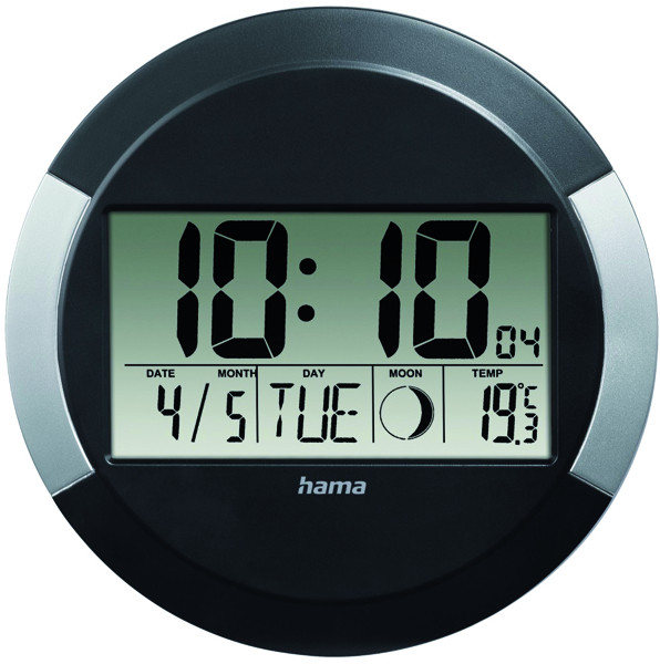 DCF-Funkuhr mit automatischer Zeitanpassung an die genaueste Uhr der Welt. Die Zeitzone lässt sich manuell einstellen, wenn sich die DCF-Zeit von der der Zeitzone unterscheidet. Dank ausklappbarem Standfuß auch als Tischuhr verwendbar. Anzeige der Mondphasen zum jeweiligen Tag - von Neumond bis abnehmender Mond. Anzeige der Innentemperatur. Maße: 24,5 x 1,5 cm (Ø x T), Einsatzbereich: Innenbereich, Art der Anzeige: digital mit Datumsanzeige, Stromversorgung: Batterie (im Lieferumfang enthalten), Gewicht: 409 g, Werkstoff: Kunststoff, Farbe des Gehäuses: schwarz/silber