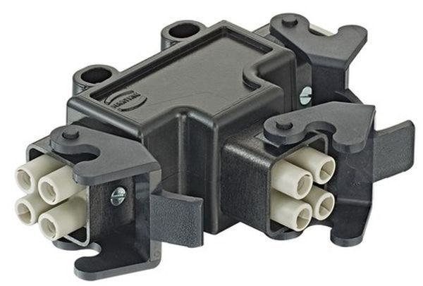 Energieverteiler, mit 3x Han Q 4/0, im Han 3 A Anbaugehäuse, Kontakte: 4, Werkstoff Gehäuse: Polyamid (PA), RAL 9005 (tiefschwarz), Schutzart: IP44, IP67 mit Dichtschraube 09200009918