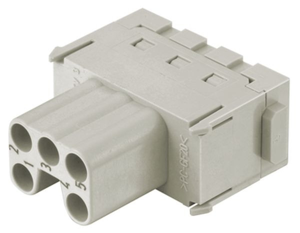 Han ES Modul, Einzelmodul, Käfigzugfederanschluss, Buchse, Kontakte: 5, Leiterquerschnitt: 0,14...2,5 mm², Bemessungsstrom: 16 A, Polycarbonat (PC), RAL 7032 (kieselgrau), Kupferlegierung, versilbert