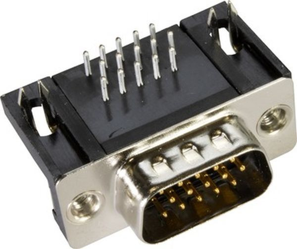 Steckverbinder, Wellenlötanschluss, Bemessungsstrom: ?2 A, Stift, Baugröße: D-Sub 1, Thermoplastischer Formstoff, glasfaserverstärkt (PBTP), Shell: Stahl, vernickelt, schwarz, Kontakte: 15, Kupferlegierung, Edelmetall über Ni steckseitig, Sn über Ni anschlussseitig