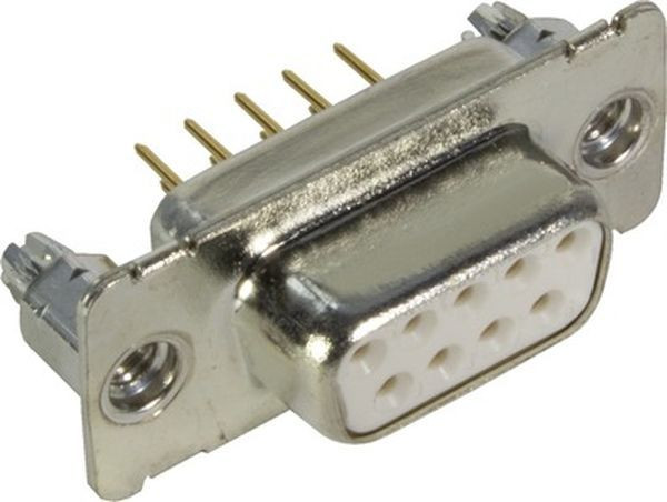 Steckverbinder, Wellenlötanschluss, Bemessungsstrom: ?7,5 A, Buchse, Baugröße: D-Sub 1, Thermoplastischer Formstoff, glasfaserverstärkt (PBTP), Shell: Stahl, verzinnt, weiß, Kontakte: 9, Kupferlegierung, Edelmetall über Ni steckseitig, Sn über Ni anschlussseitig