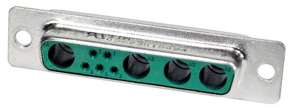 Steckverbinder, Lötkelchanschluss, Bemessungsstrom: ?5 A, Buchse, Baugröße: D-Sub 3, Thermoplastischer Formstoff, glasfaserverstärkt (Polyester), Shell: Stahl, verzinnt, grün, Kontakte: 9, Leiterquerschnitt: 0,5 mm², Kupferlegierung, Edelmetall über Ni