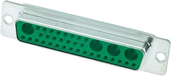 Steckverbinder, Lötkelchanschluss, Bemessungsstrom: ?5 A, Buchse, Baugröße: D-Sub 5, Thermoplastischer Formstoff, glasfaserverstärkt (Polyester), Shell: Stahl, verzinnt, grün, Kontakte: 36, Leiterquerschnitt: 0,5 mm², Kupferlegierung, Edelmetall über Ni