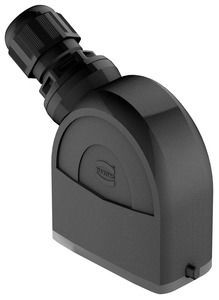 Tüllengehäuse, mit integrierter Kabelverschraubung, Baugröße: 10 A, Längsbügel, seitlicher Kabeleingang, 1x M25, Werkstoff Gehäuse: Polyamid (PA), glasfaserverstärkt, RAL 9005 (tiefschwarz), Werkstoff Dichtung: FPM