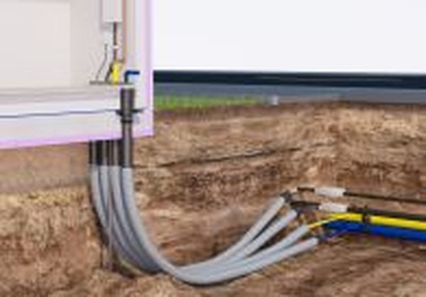 Gas- und wasserdichte Hauseinführung zum gemeinsamen Einführen und Abdichten aller Versorgungsleitungen (Strom, Wasser, Telekommunikation, optional Gas), Mehrsparten-Bauherrenpaket für Gebäude ohne Keller, Abdichtung aller Versorgungsleitungen durch eine Einführung, durchgängige Schutzrohrverbindung bis zu den Hauptversorgungsleitungen an der Grundstücksgrenze, alle Gewerke werden getrennt voneinander geführt, die Anordnung der einzelnen Sparten ist flexibel, geeignet für den Einsatz aller gängigen Gashauseinführungskombinationen, auf Druckdichtheit geprüftesLeerrohrsystem, einfache Einbindung der Dampfsperre über Klebeflansch