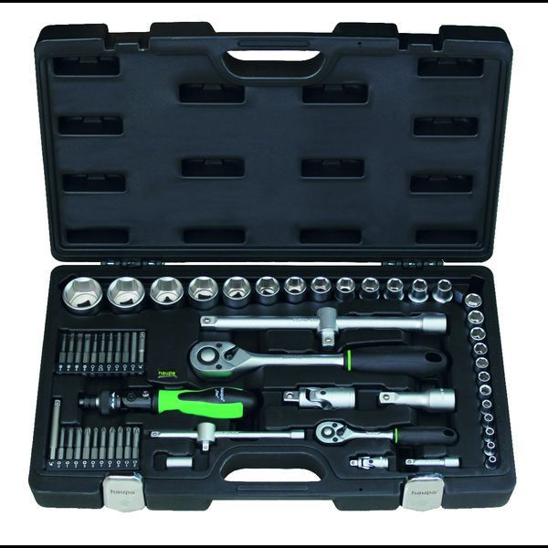 Chrom-Vanadium-Stahl, Industriequalität, schwarzer Kunststoffkoffer mit Metallverschlüssen, inkl. HAUPA Knarrenschraubendreher „FlexPlus“. Inhalt: 12 1/4" Steckschlüsseleinsätze 4 - 4,5 - 5 - 5,5 - 6 - 7 - 8 - 9 - 10 - 11 - 12 - 13 mm 2 1/4" Verlängerungen 50 und 150 mm 1 Adapter 3/8" x 1/4" für Verlängerung zur Verwendung als T-Griff 1 1/4" Kardangelenk 1 Bit-Adapter 1/4" 4-Kant auf 1/4" Sechskant 1 1/4" Umschaltknarre 13 1/2" Steckschlüsseleinsätze 10 - 11 - 12 - 13 - 14 - 15 - 17 - 19 - 22 - 24 - 27 - 30 - 32 mm 2 1/2" Verlängerungen 75 und 250 mm 1 Adapter 3/8" x 1/2" für Verlängerung zur Verwendung als T-Griff 1 1/2" Kardangelenk 1 1/2" Umschaltknarre 1 Knarrenschraubendreher FlexPlus 1 Adapter 1/4" x 1/4" x 50 mm 1 Adapter 1/4" x 1/4" x 80 mm 4 Bits 1/4", 50 mm, PH 0 - 1 - 2 - 3 4 Bits 1/4", 50 mm, PZ 0 - 1 - 2 - 3 2 Bits 1/4", 50 mm, PZ/FL 1 - 2 4 Bits 1/4", 50 mm, Schlitz 3 - 4 - 5 - 6 mm 6 Bits 1/4", 50 mm, Innensechskant 2 - 2,5 - 3 - 4 - 5 - 6