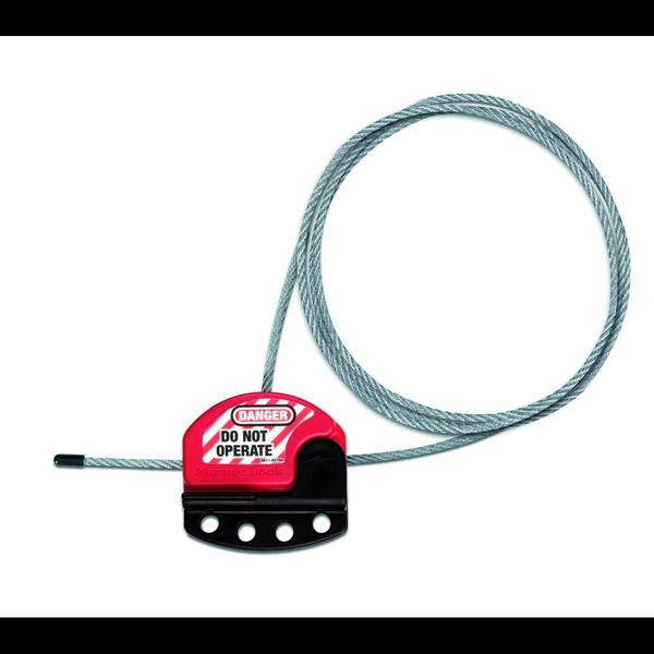 Einstellbare Seilverriegelung (1,8 m) für verschiedene Anwendungen der Sicherheitsverriegelung einstellbare Länge des Seils (geflochtenes Stahlkabel 1,8 m x Ø 4 mm mit Kunststoffbeschichtung) Körper aus thermoplastischen Zenex ist chemikalienbeständig flexibles und einfaches Einfügen in verschiedene Verriegelungspunkte integrierter Sicherheitsschließbügel für bis zu 4 Vorhängeschlösser mit max. 6 mm Bügeldurchmesser ideal für Mehrfachverriegelung mit wiederverwendbaren, beschreibbaren Sicherheitsetiketten (EN, FR, SP) für den Einsatz in explosionsfähiger Atmosphäre geeignet