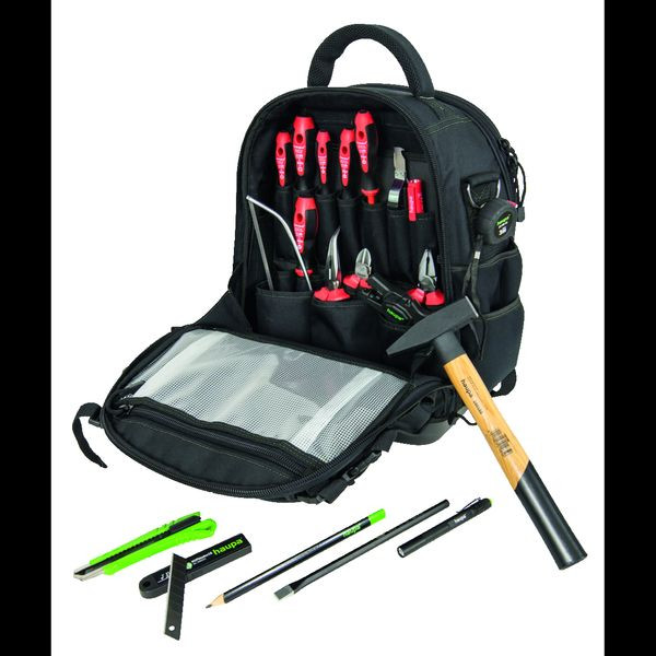 Mobil unterwegs dank dem neuen HAUPA Werkzeugrucksack HUPtoGo2 personalisierbar durch bestickbares Klettpad an Fronttasche 41 Fächer, davon 6 Außentaschen (3 Neopren) 4 Innentaschen mit Reissverschluss Fronteinstecklaschen Neopren (z.?B. Wasserwaage, lange Meißel) praktisches abnehmbares Kniepad wasserdichte hohe Bodenschale zum Schutz vor Nässe Reflexstreifen an der Front 2 Metall Befestigungsösen seitlich ergonomisch gepolsterte verstellbare Schultergurte gepolstertes Rückenteil und Tragegriff hohe Kippsicherheit, auch im geöffneten Zustand Material: extrem starkes 1680D-Polyester Farbe: schwarz mit grauen Nähten Werkzeugrucksack HUPtoGo 220249 Inhalt: VDE-Storchschnabelzange gebogen 200 mm* VDE-Kombizange 180 mm* VDE-Seitenschneider 160 mm* VDE-Schraubendreher-Set HUPslim PH Cuttermesser HUPblackSeries18 Cutterklingen HUPblades18 LED Taschenlampe Pen Torch Abisolierzange Basic 0,5 – 6 mm² Basic Abmantler 8 – 28 mm mit Hakenklinge Test Pen Profi 12 – 1000 V Schlosserhammer 500 g Elektrikermeißel 10 x 250 mm Puk-Säge mit festem Griff Zimmermannsbleistift, schwarz, Mine 7B, dreieckig, 240 mm Maßband 3 m * Perfektionierte Schneidkraft-Performance