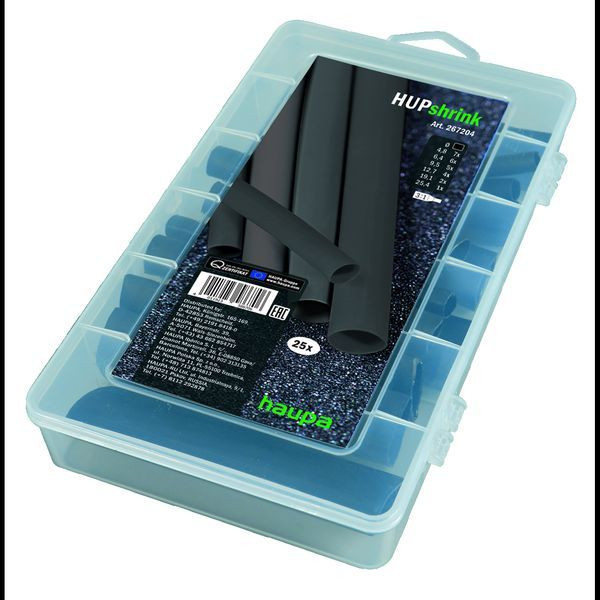 aus strahlungsvernetztem Polyolefin, selbstverlöschend nach MV SS 302, flexibel, universell einsetzbar, Durchschlagfestigkeit: 15 - 25 KV/mm nach DIN 53481, Schrumpftemperatur > 80° C, Dauergebrauchstemperatur - 55° C bis 125° C, 25-tlg., in Kunststoffbox, doppelwandig, mit Innenkleber