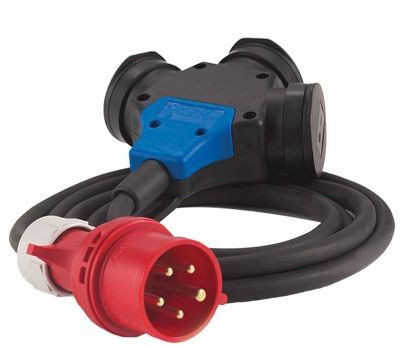 Adapterkabel Drehstrom-Schutzkontaktmit einer 2,5 langen Anschlussleitung H07RN-F 5G2,5 in schwarz mit CEE-Anschlussstecker 5x16 A / 400 V und einer3-fach Schutzkontakt-Hängekupplung 250 V mit Schutzdeckeln, Schutzart IP44.Da jede der drei Schutzkontakt-Steckdosen an eine eigene Phase angeschlossen ist, kann eine maximale Gesamt-Ausgangs-Leistung von 9,5 kW erreicht werden.