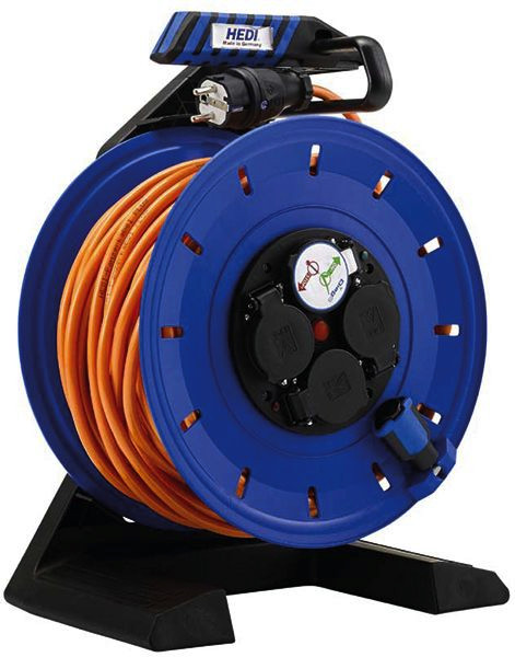 Vollkunststoff-Kabeltrommel HEDI Generation 7 Champion Trommelkörper und Tragegestell aus robusten Kunststoffen für ein Höchstmaß an Sicherheit. Mit ergonomisch geformtem Tragegriff und großem, ausklappbaren Drehgriff mit Zwei-Komponenten Soft-Touch für mehr Anwender-Komfort, Kabelführung sowie dem bewährten HEDI Rotationsstoppschalter zur Arretierung des Trommelkörpers. Mit 50 m HEDI Panzerkabel PLUS H07BQ-F 3G1,5, orange, Ø 290 mm, spritzwassergeschützter Steckdoseneinsatz mit 4 Schuko-Steckdosen 250 V, Stecker-Dichtungslippe, HEDI Diagnosesystem DiagS und Thermoschutzschalter, Schutzart: IP44. Der Artikel ist gemäß den geltenden Normen zugelassen und entspricht den Vorgaben gemäß der DGUV-I 203-005, K2 sowie der DGUV-I 203-006 für den ständigen Einsatz auf Bau- und Montagestellen.